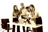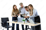 Group of young modern people in formalwear using modern technologies while working on a transparent background