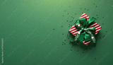 Merry Christmas and Happy Holidays greeting card, frame, banner. New Year. Christmas ornaments gift, present on green background top view. Xmas holiday festive theme. Christmas decoration