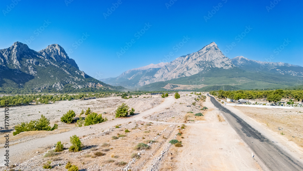 Aerial drone view of mountains landscape and countryside road, Antalya province, Turkey