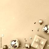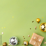 Christmas gift with gold ornaments on a green background.
