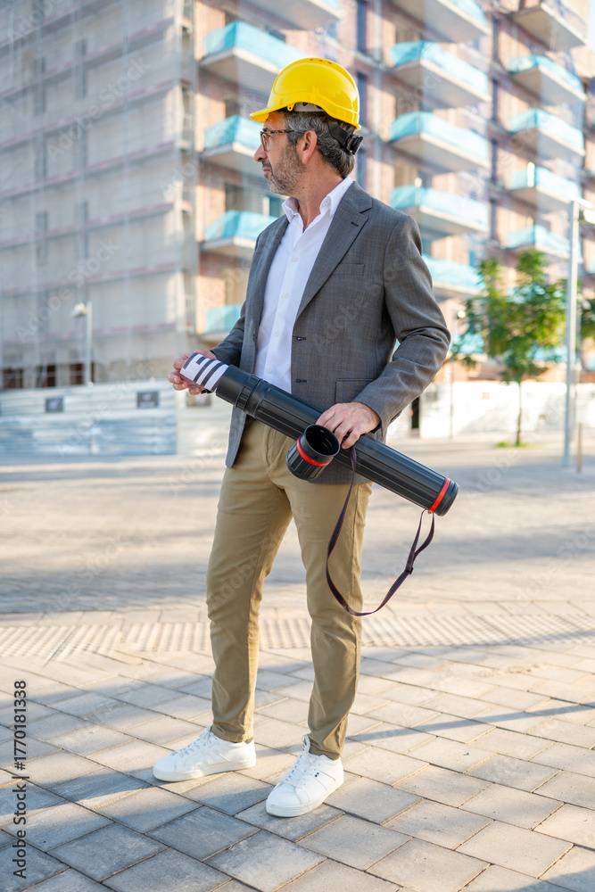 Architect engineer man inspecting building construction site