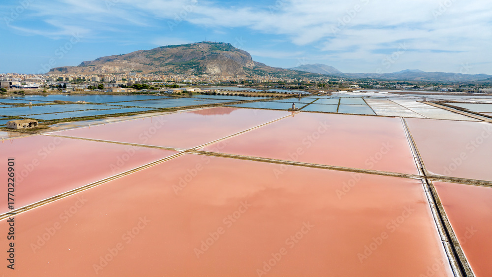 Aerial view of the Trapani salt pans, in Sicily, Italy. Mount Erice is in the background on the horizon.
