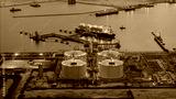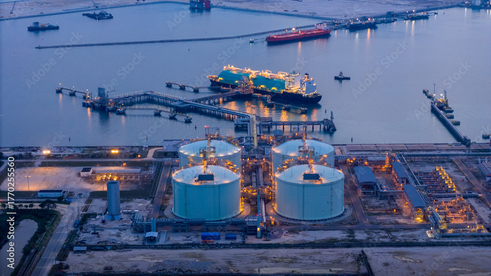 LNG (Liquified Natural Gas) tanker anchored in Gas terminal gas tanks for storage. Oil Crude Gas Tanker Ship. LPG at Tanker Bay Petroleum Chemical or Methane freighter export import transportation