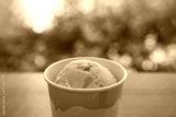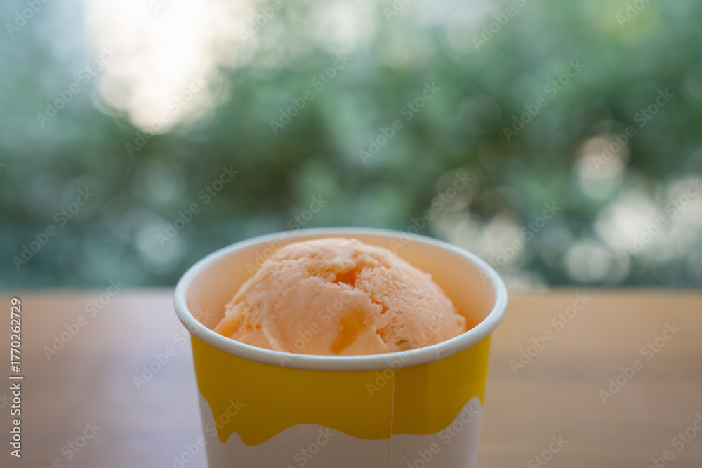 Orange scoop of ice cream in yellow paper cup placed on wooden table with blurred green background. Perfect for dessert themes, summer treats, frozen sweets, and refreshing snack concepts.
