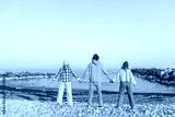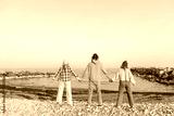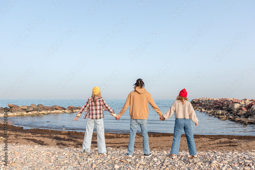 Rear view of Three friends holding hands enjoying the view of the sea on a sunny day at the beach