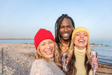 Happy multiracial friends laughing together and taking selfie on the beach
