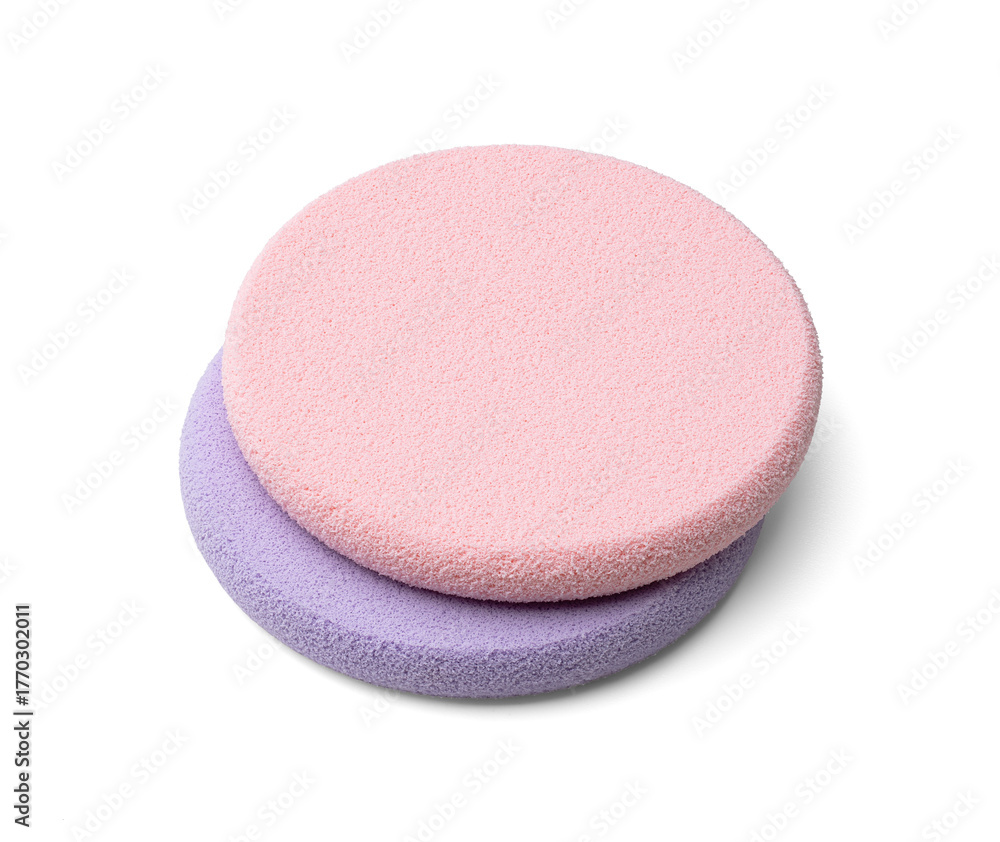 Bright makeup sponges on a white background. Makeup products. Makeup application tools.