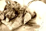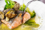 A fork cuts into a beautifully plated fish fillet, served with clams and green vegetables in a savory sauce on a white plate.
