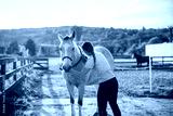 Woman grooming horse at paddock. Female rancher using animal brush to care her horse