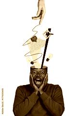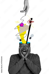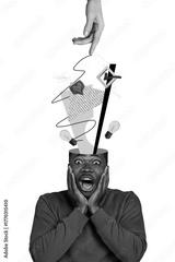 Vertical photo collage of crazy shocked american man cut head like notification light bulb plan checkmark isolated on painted background
