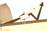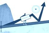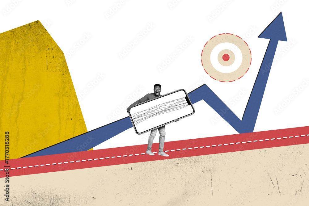 Composite trend artwork collage of trader business rich income graphics arrow up workspace young man hand hold phone display remote job