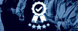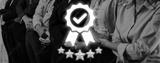 Professional group standing together symbolizes teamwork and success, enhanced by an award icon and five stars, representing achievement and recognition in business. Trope