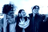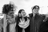 Diverse group of gen z happy friends having fun together on winter vacation. Multicultural teenage people laughing outdoors. Friendship concept