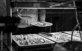 Hotel guests serve food on plates from the buffet in the hotel restaurant