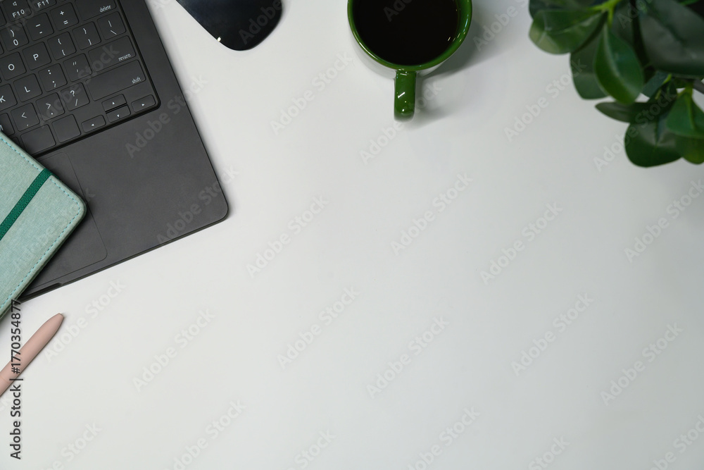 Flay lay, Top view office table desk with computer, coffee, pen, leaves with copy space background.