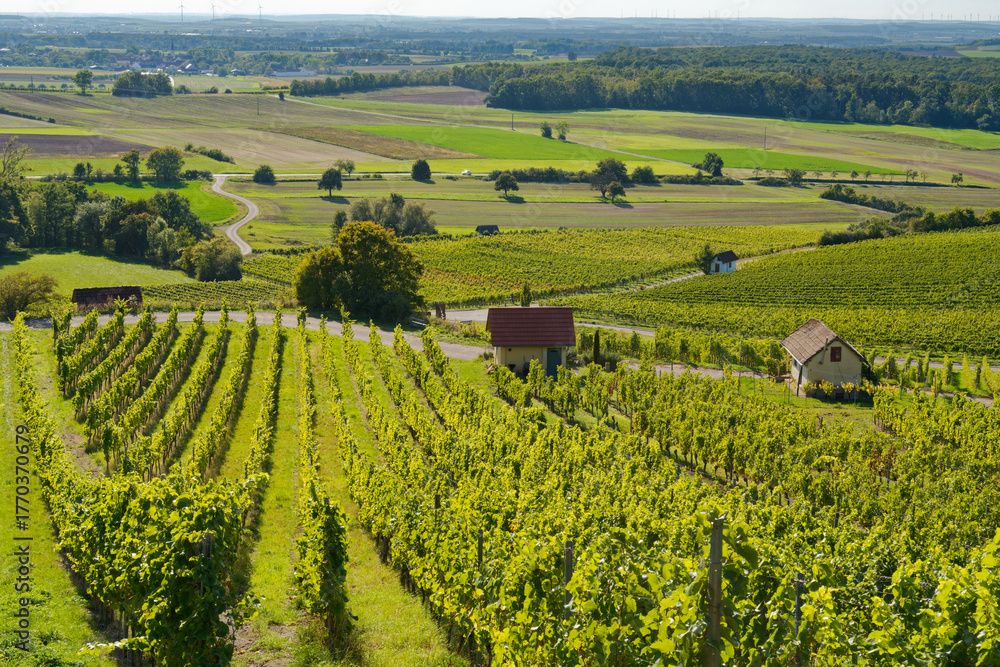 Weinberge am Falkenberg und historische Weinberghäuschen bei Falkenstein, Gemeinde Donnersdorf, Landkreis Schweinfurt, Unterfranken, Franken, Bayern, Deutschland