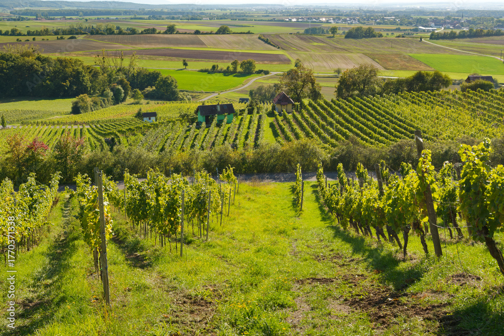 Weinberge am Falkenberg und historische Weinberghäuschen bei Falkenstein, Gemeinde Donnersdorf, Landkreis Schweinfurt, Unterfranken, Franken, Bayern, Deutschland
