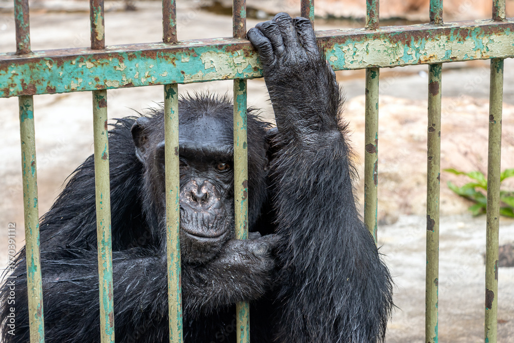 Wet chimpanzee looks through the bars of a cage at the zoo