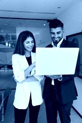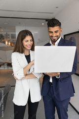 Two positive multiethnic coworkers using laptop, standing in boardroom