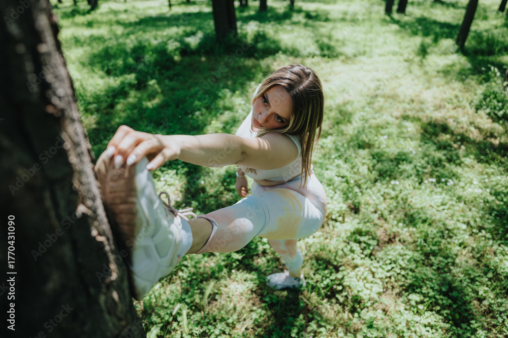 A young woman exercises outdoors, stretching her leg against a tree in a green park environment. The image exudes fitness, health, mindfulness, and a connection to nature.