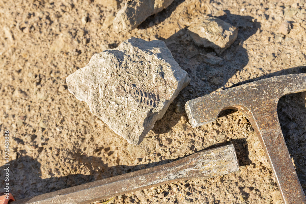 Hammer, chisel and imprint of Cambrian trilobite on limestone stone