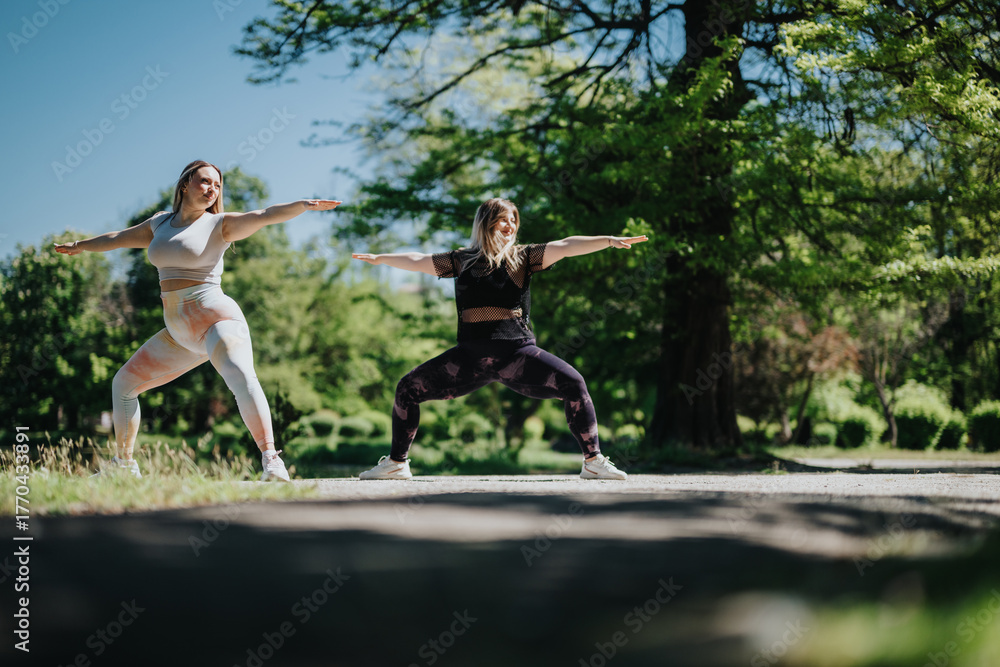 Two women engaging in yoga exercises to improve fitness and cut weight, surrounded by vibrant greenery in a tranquil park setting, embracing an active and healthy outdoor lifestyle.