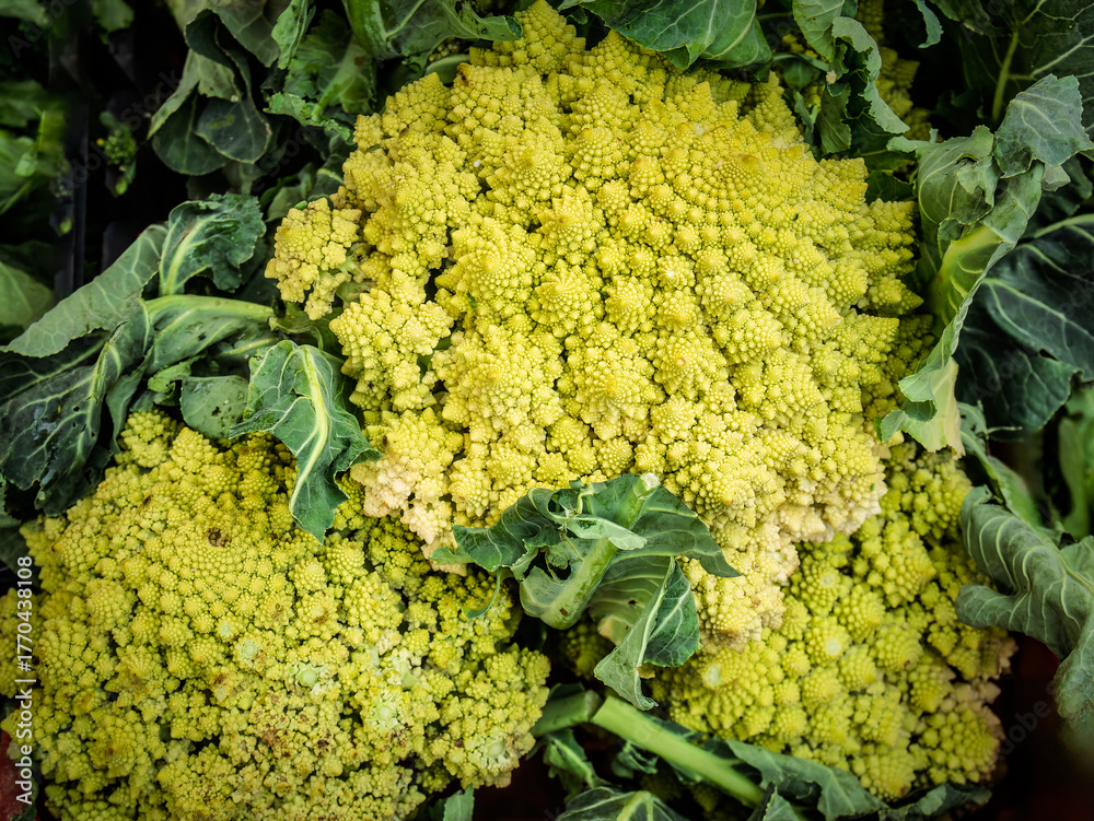 Fresh Romanesco Broccoli Heads With Green Leaves Displayed In A Busy Farm Market Today