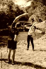 A man and woman perform stretching exercises in a natural setting near a river. The activity is surrounded by lush greenery, promoting physical fitness while enjoying the tranquility of the outdoors.