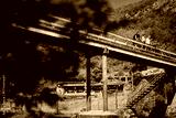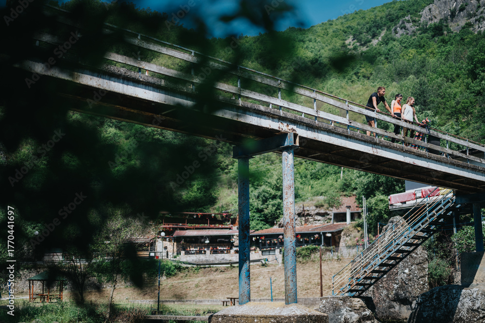 A group of friends pauses on a rustic bridge amidst lush greenery and scenic hills. The calm environment reflects outdoor leisure, exploration, and the serene backdrop of nature.