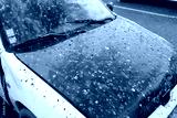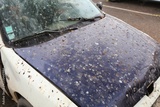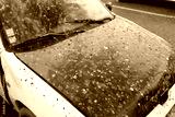 Bird poop on car hood. Dirty, stained car covered in bird poop. Parking problem.