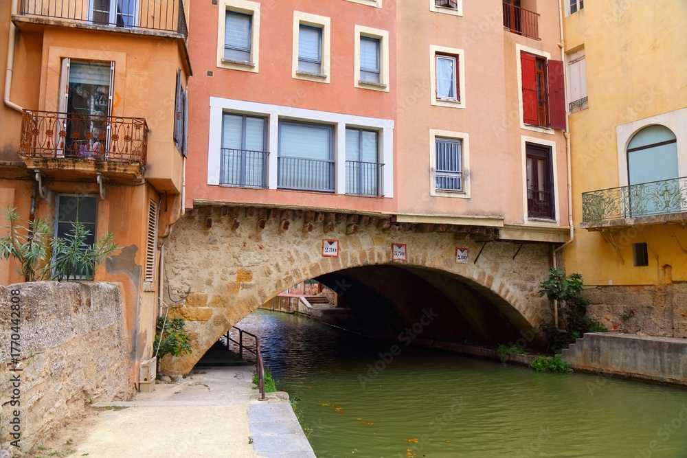 Narbonne city, France. Cityscape with Canal de la Robine.