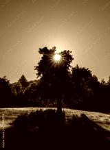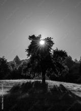 sun backlit a tree showing the silhouette, with the tree shadow in the foreground