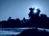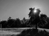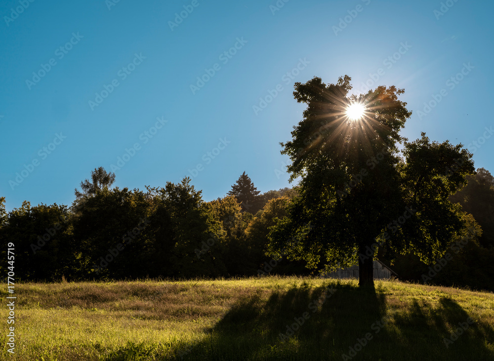 sun backlit a tree showing the silhouette, with the tree shadow in the foreground