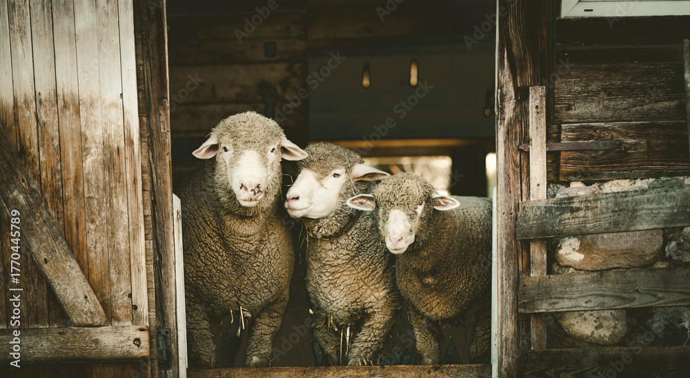 farm animals in barn, family of sheep looking at the camera for a portrait, in a romantic manner