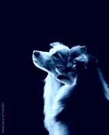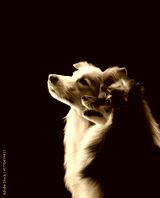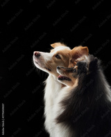 Two dogs, a border collie and a sheltie, are captured together. The dogs are facing different directions with dark background and dramatic light.