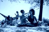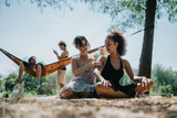 Two women sit on a blanket in a sunny park, chatting and relaxing, while friends lounge in a hammock in the background. A casual, carefree summertime moment.