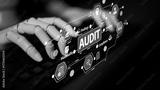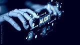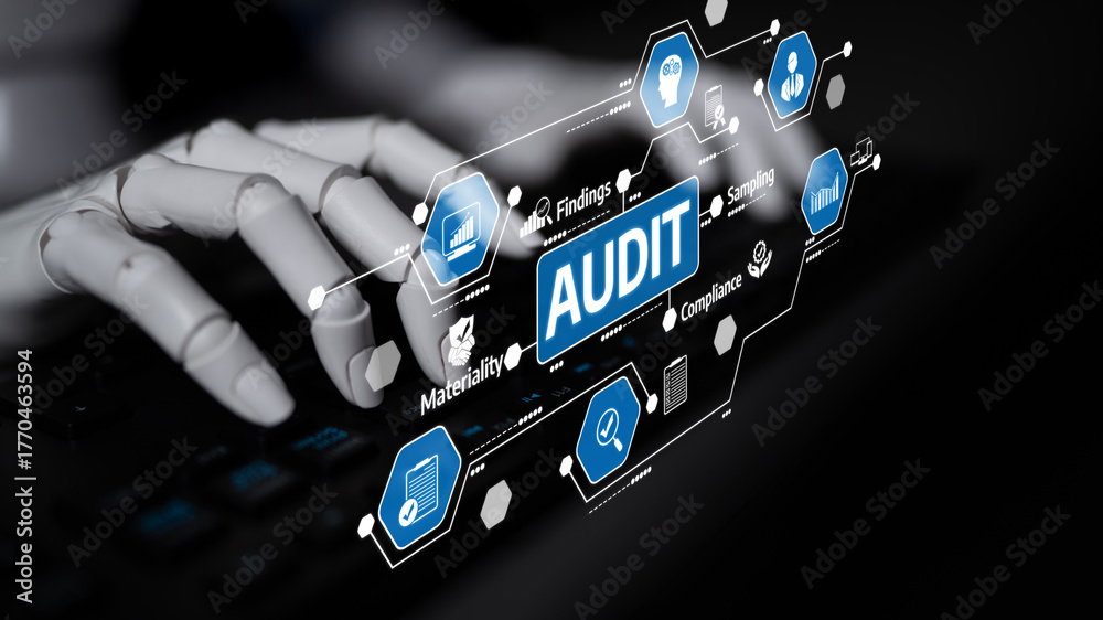 A futuristic robotic hand interacts with a digital audit interface, showcasing various icons related to data analysis, compliance, and technology in a modern workspace setting. Tessel
