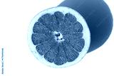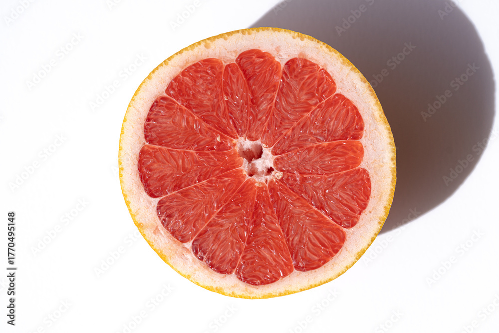 Half grapefruit cross-section on white shows radiant red pulp; crisp detail, selective focus and hard shadow suggest fresh healthy food, vitamin C, healthy life and happiness.