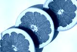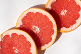 Three grapefruit halves sweep across white in a gentle curve; vivid pulp detail and clean shadows; selective focus supports healthy food, vitamins, healthy life, kids, and happiness messaging.