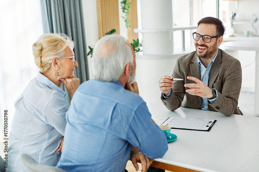 Senior couple having a meeting with an agent, businessman, salesperson or doctor in his office