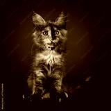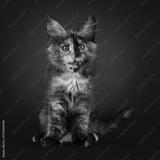 Black tortie Maine Coon cat kitten sitting up facing front. Looking towards camera, with mouth open. Isolated on a black background