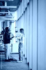 Diverse colleagues discussing work, collaborating in modern office