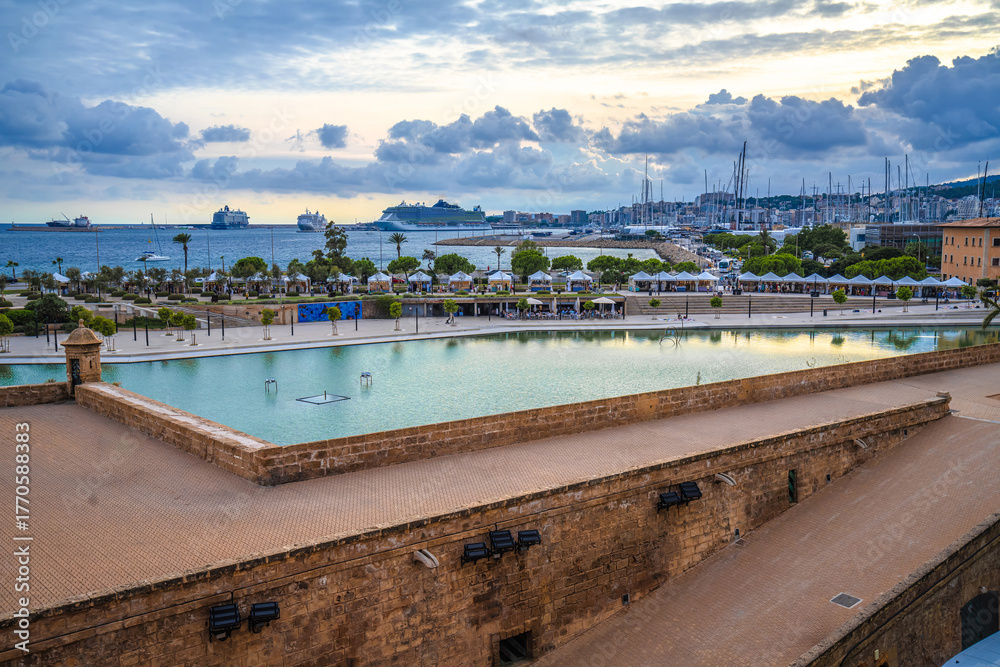 Island of Mallorca. Palma de Mallorca scenic cathedral waterfront view.