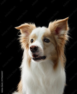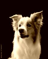 A border collie in half-profile shows curiosity and alertness. Lighting enhances the reddish fur and the softness of the gaze.