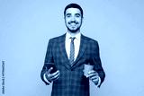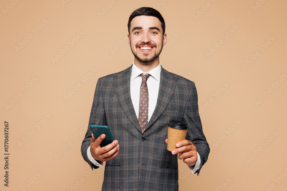 Young happy successful employee business man corporate lawyer wear classic formal grey suit shirt tie work in office hold use mobile cell phone drink coffee isolated on plain beige background studio