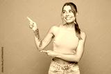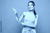 Young happy smiling woman she wear pink tank top casual clothes point index finger aside on blank empty area mockup isolated on plain pastel light purple background studio portrait. Lifestyle concept.