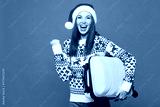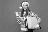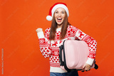 Traveler woman wear red Santa hat hold bag do winner gesture isolated on plain orange background. Tourist travel abroad in free time rest getaway. Air flight journey, Happy New Year Christmas concept.