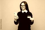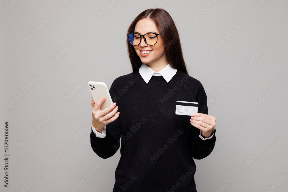 Young employee business woman corporate lawyer wear black sweater glasses shirt work in office using mobile cell phone hold credit bank card shopping online isolated on plain grey color background.