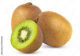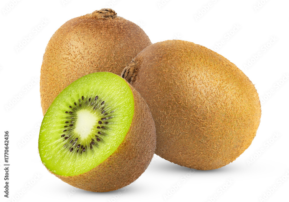 Two kiwi fruits with cut in half isolated on white background.