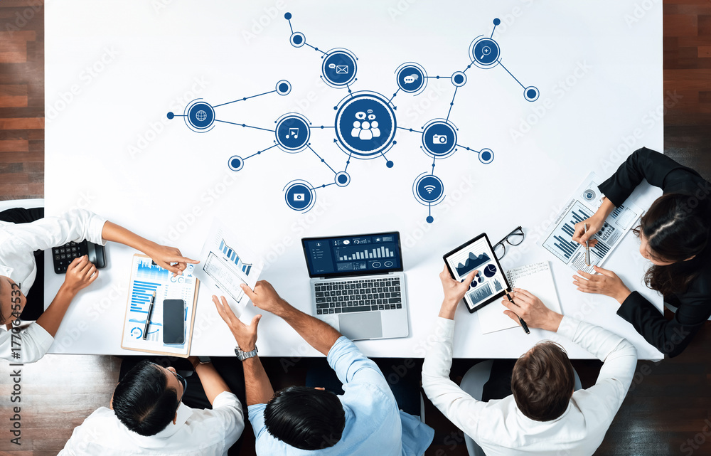 A diverse group of professionals engaging in a collaborative business meeting, showcasing digital media strategy with graphs and technology on the table for effective communication. Amity